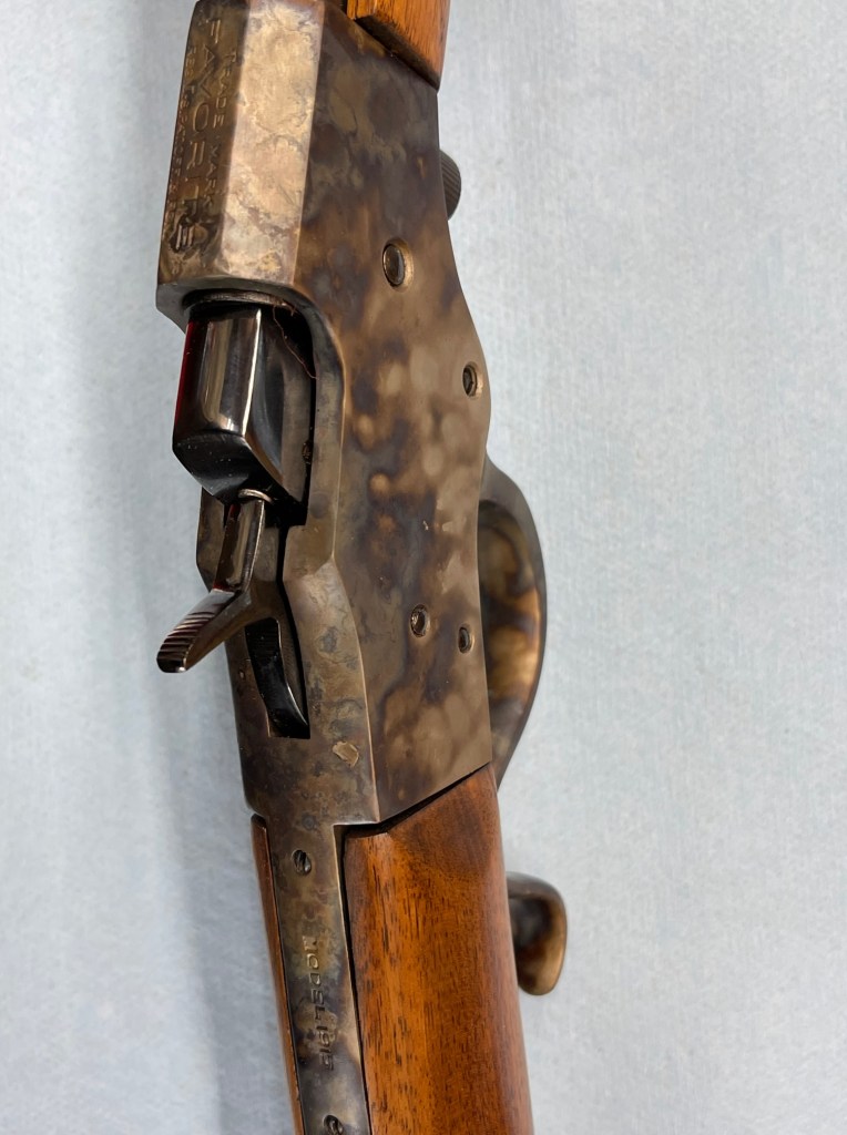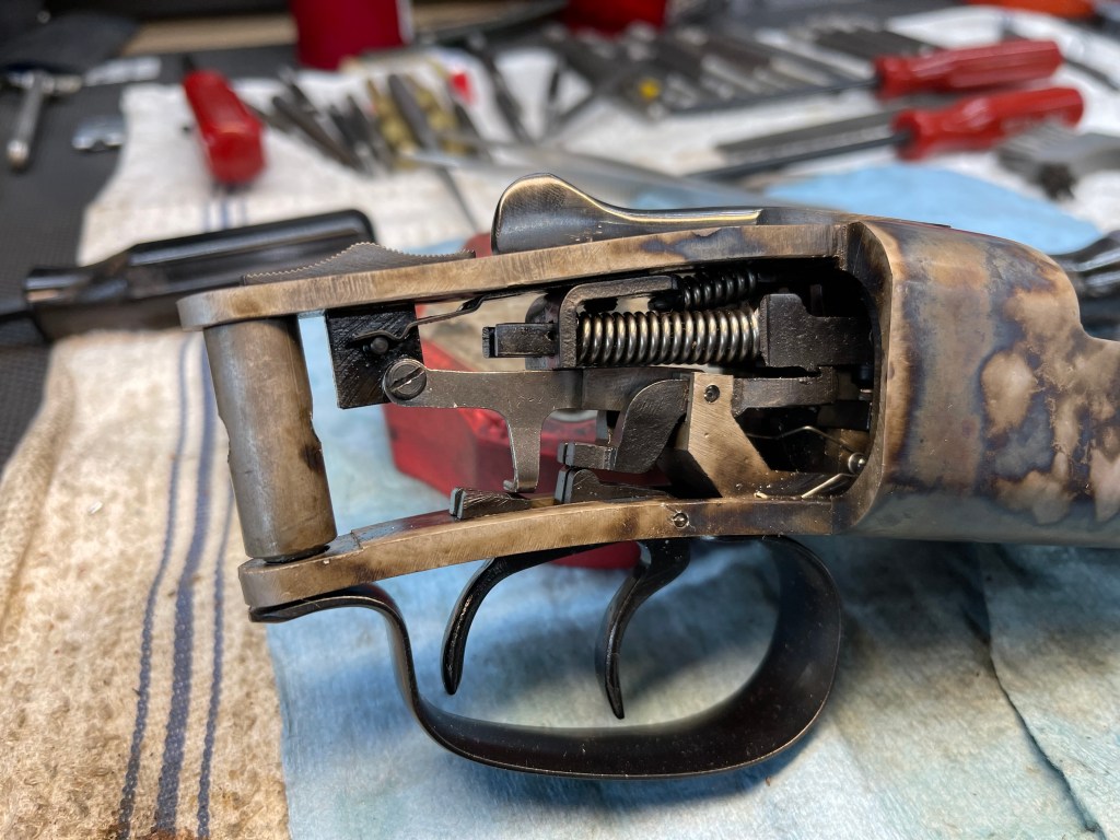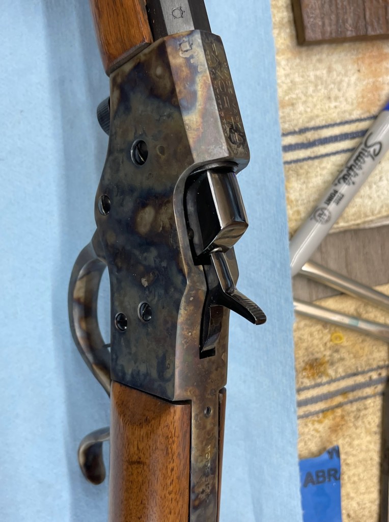 Fresh carbona blued partsConverted Winchester 1897 to trench gunColt LightningCarbona blued Colt SAAColt SAA resorted with cabona (Carbonia or Machine) bluingColt SAA before restorationmachine blued partsCarbona “Carbonia” machine blued Colt HuntsmanCarbonia machine blued partsBrowning 1919A4 in 30-06 original WWII gunCustom L C Smith with new wood, case colored and rust bluedWinchester 1890, surface ground receiverStevens favorite 1915Winchester 1873Colt HuntsmanBrowning Auto 5 1920’s early 16 gaugeFN27Browning 1922Remington 12Steven Favorite 1915 case colorSteven Favorite 1915 and Remington 16Stevens crackshot 26Remington 12 original stockWinchester 1873K.O. Surface grinderWinchester 1894Browning Auto 5 with custom MapleCase colored Colt HuntsmanMarlin 336Marlin 336Racks ready for bluingPistols ready in line for bluingCustom Dulite 2 temp Bluing roomblack, clario and English WalnutHighly figured English WalnutCustom stocks in various stages of finishProject guns English, Clario and Black WalnutTerrco stock duplicator36″ glass bead blasterMarlin Texan 33630W fiber MOPA laserWinchester 1894 restored to Deluxe versionCustom built Schuetzen in 32-40Winchester Model 24 restorationWinchester Model 24 inside restored to newmachine blued parts known as Carbonia blued