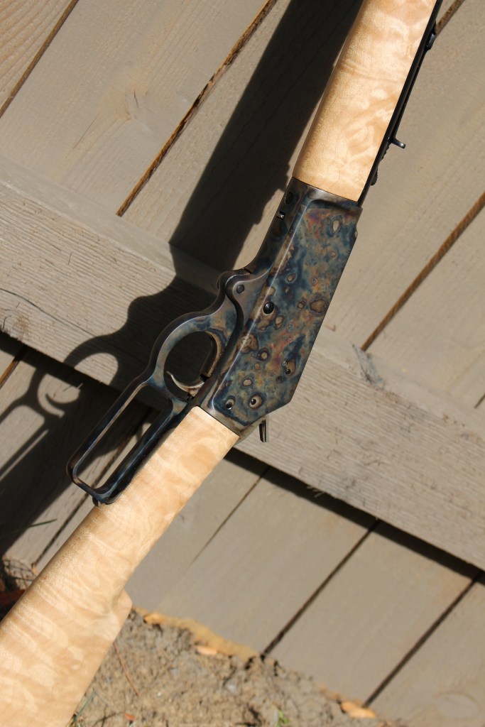 Case color hardening – Case-coloring is a great way to create a one-of-a-kind gun. The process of refinishing, polishing, and baking in a special charcoal mixture for a few hours, followed by a quench in cold water, creates a uniquely special gun. No two are alike. This requires an open mind to enjoy the variations of colors and patterns a gun will obtain. Some old metals do have issues with case coloring and we will advise accordingly. This is a lost art that is done differently by all, but our method creates very little to no metal distortion and no charcoal pitting, while giving great, consistent color variations. Often people consider this option when re-engraving is required due to the deep level of pitting. A case colored gun hides imperfections that bluing will not, therefore is a viable option to save money in many circumstances.
